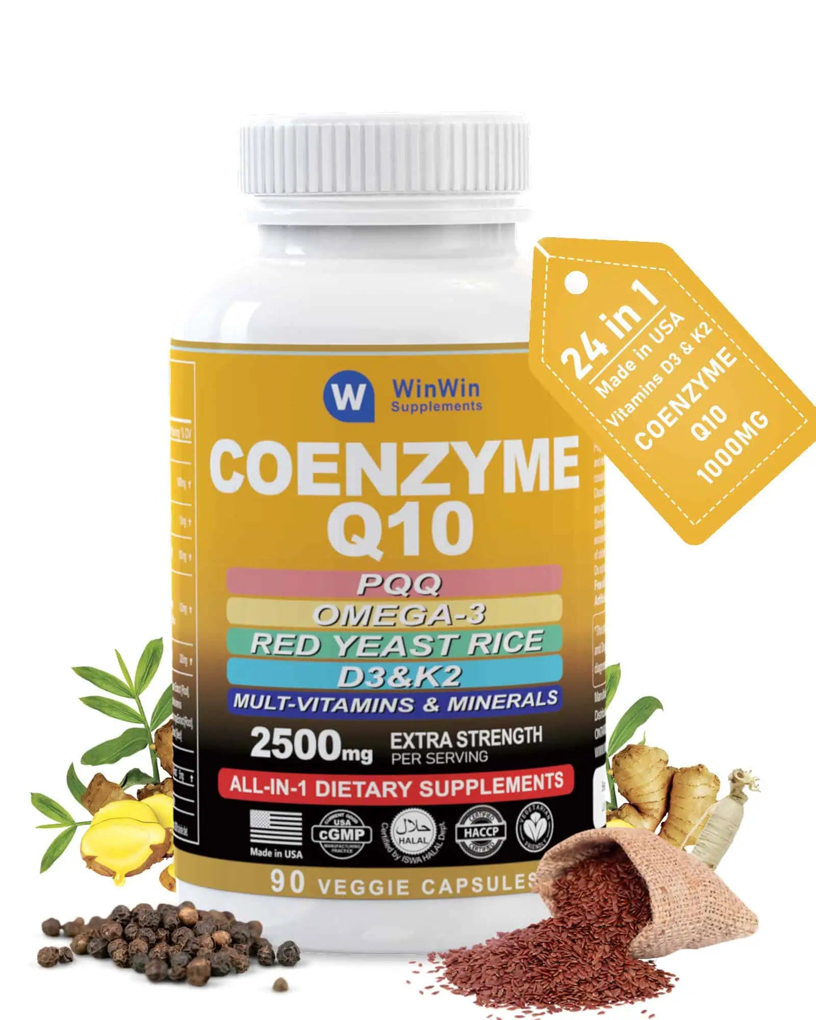 - Comprehensive Health Support: 24 in 1.Expertly formulated with CoQ10 1000mg, PQQ, vegan Omega 3 Fish Oil, Red Yeast Rice for cholesterol, and 15 essential multivitamin and minerals (including vitamin C, D3, K2, A, B complex, magnesium, manganese 168mg, and folic acid). Our unique blend is further enriched with immune-boosting components: Green Tea, Resveratrol, Quercetin, Turmeric, and an absorption-enhancing agent, Black Pepper 5mg, ensuring optimal nutrient uptake. Elevate your well-being holistically, empowering the immune system, nurturing cardiovascular health, and optimizing cellular metabolism for sustained vitality and resilience.