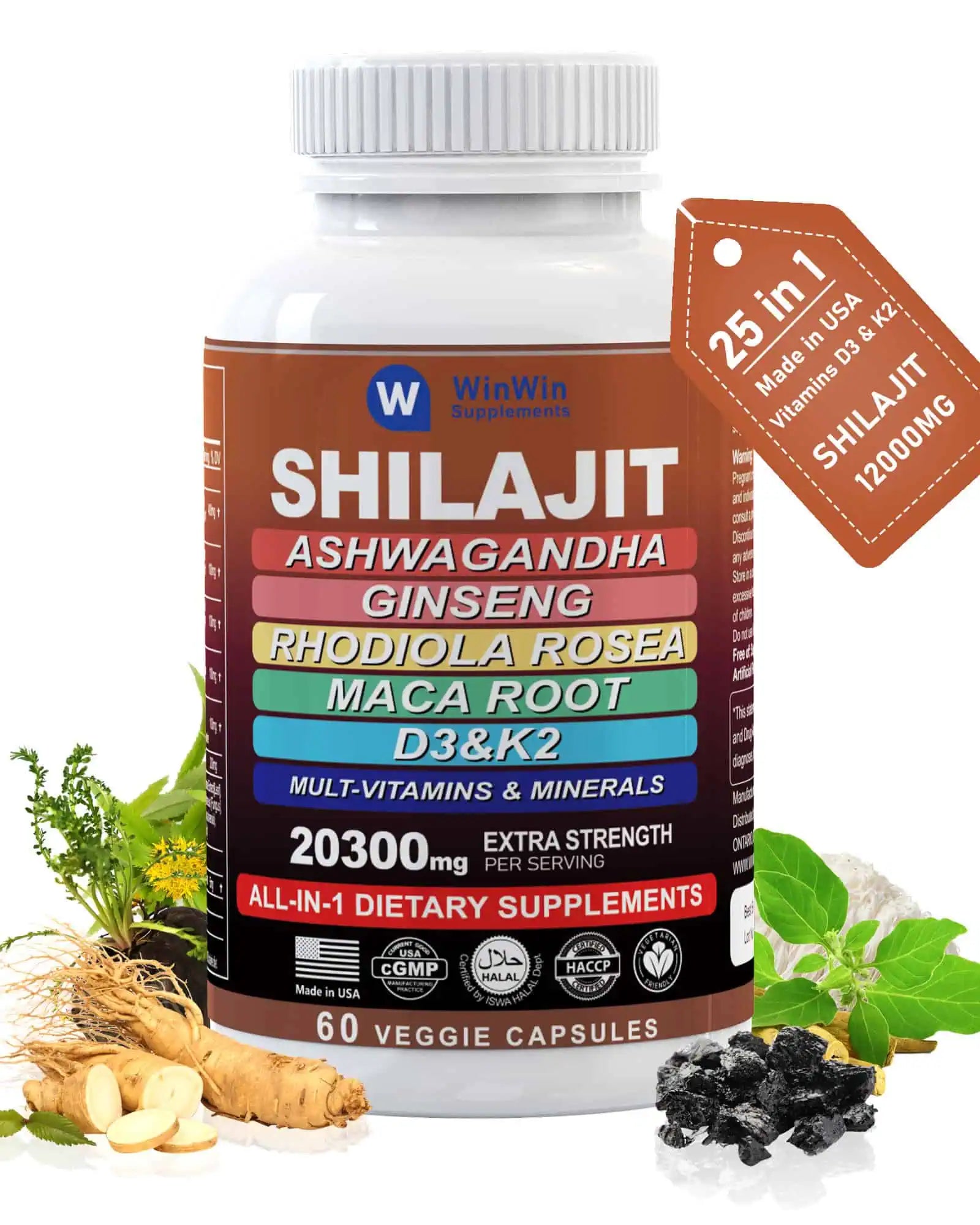- Comprehensive Health Support with 25-in-1 Formula: Our organic supplement delivers a robust array of essential nutrients, featuring 400mg of Shilajit for vital minerals and fulvic acid, Ashwagandha to help balance stress, Panax Ginseng to boost stamina, Rhodiola Rosea to combat fatigue, and Maca Root for natural energy enhancement. This powerful blend is complemented by a suite of essential vitamins and minerals, including Vitamins D3, K2, A, B1, B2, B3, B5, B6, B12, C, E, Magnesium, Manganese, and Folic Acid. Together, these ingredients support heart health, bone strength, immune function, and overall well-being, ensuring you maintain vitality and optimal health.